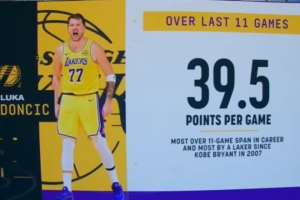 据统计,连续11场比赛场均39.5分创造了东契奇生涯最高纪录,也是湖人队史继2007年科比以来最高!