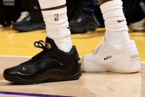 本场比赛詹姆斯上脚黑白鸳鸯的23代“Equality”配色球鞋亮相赛场。