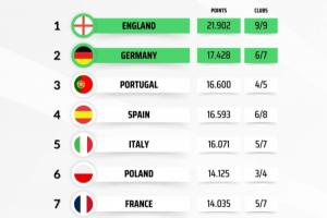 欧战系数:英格兰9队征战拿下第5个欧冠名额,德甲暂列第2意甲第5